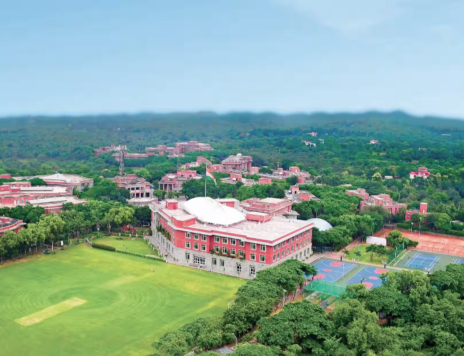 The campus provides various sports facilities including football grounds, cricket nets, basketball courts, tennis courts, badminton courts, swimming pool, gymnasium, and indoor sports facilities.